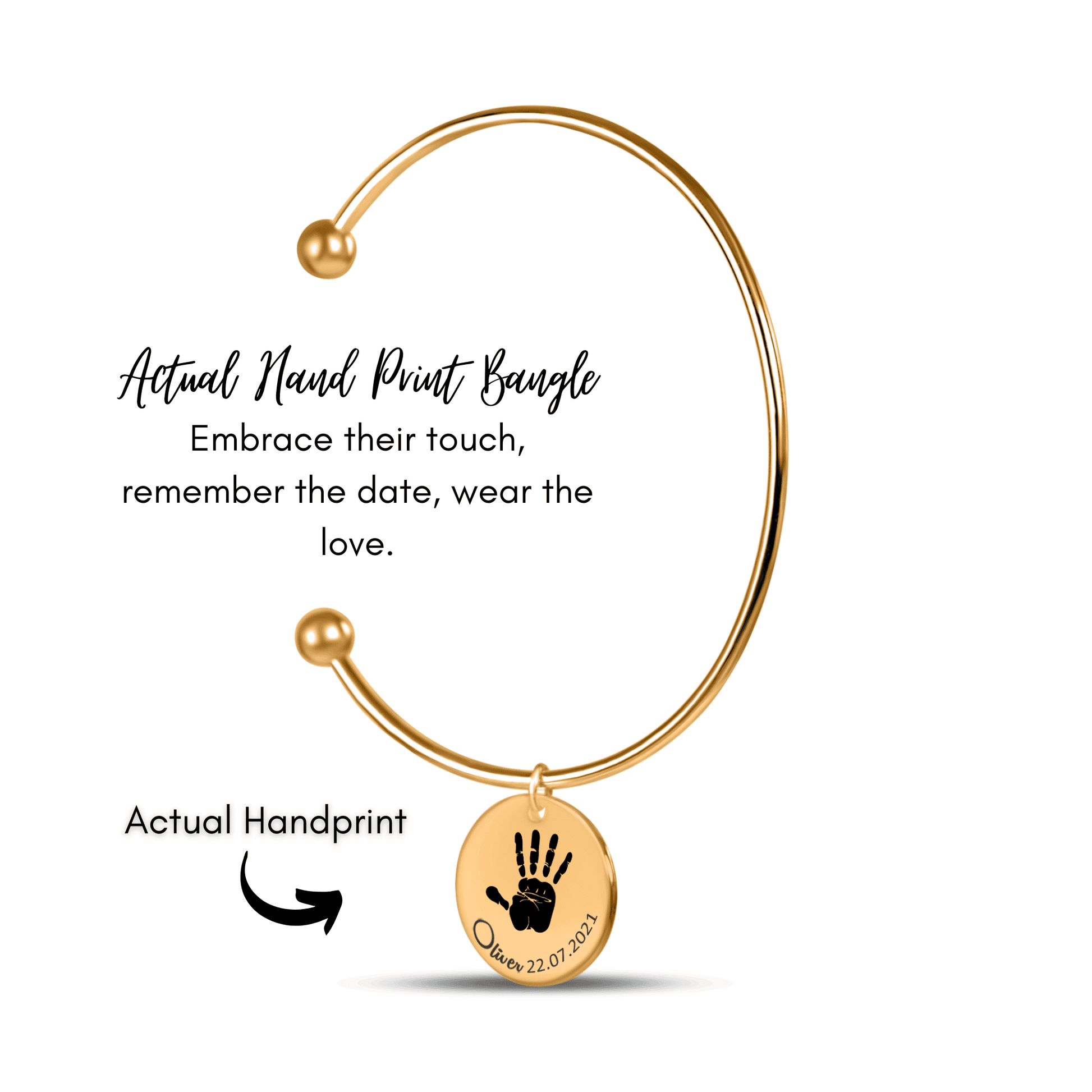 More than just a bangle… Eternalize this bangle with the handprint, birthdate, and name of your baby. Optionally, you can choose to give the bangle an even more personal touch by adding a custom message on the back. This bangle also makes the perfect gift for a baby shower, anniversary, a young mother or father, or any siblings related to the baby.