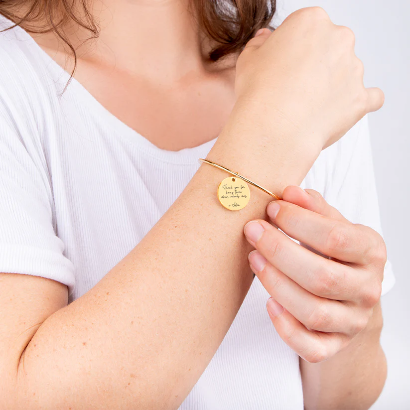 More than just a bangle…create a truly unique gift or memorial keepsake by personalizing this bangle with a custom message or quote. It can be anything from a birthday wish, a funny gift to a friend, or a quote that you love. Optionally, you can choose to give the bangle an even more personal touch by adding a custom message or coordinates on the back.