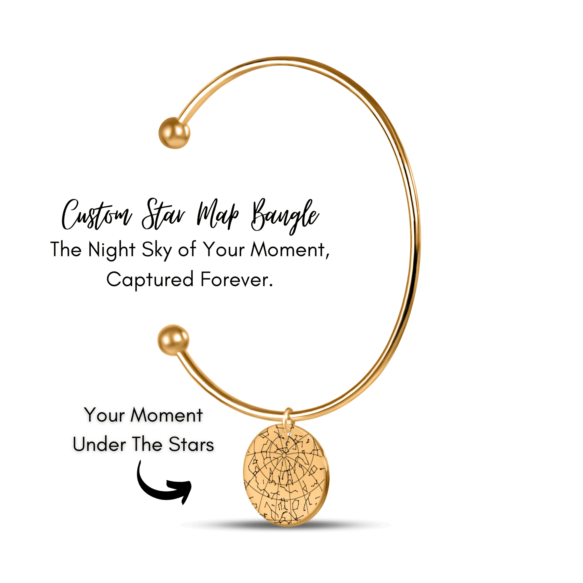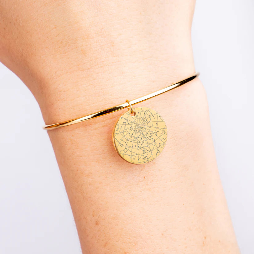 More than just a bangle…eternalize a special moment in your life with a custom star map bangle. Was it the day you met your soul-mate, the day you passed an important exam, the birth of a child or the day you realized your world has changed? Simply add a date and a place, and our designers will customize a star map that shows exactly how the sky was looking on that specific day, from that specific place. Optionally, you can choose to give the bangle an even more personal touch by adding a custom message or coordinates on the back. This bangle also makes the perfect gift for anniversaries, birthdays, couples & more.